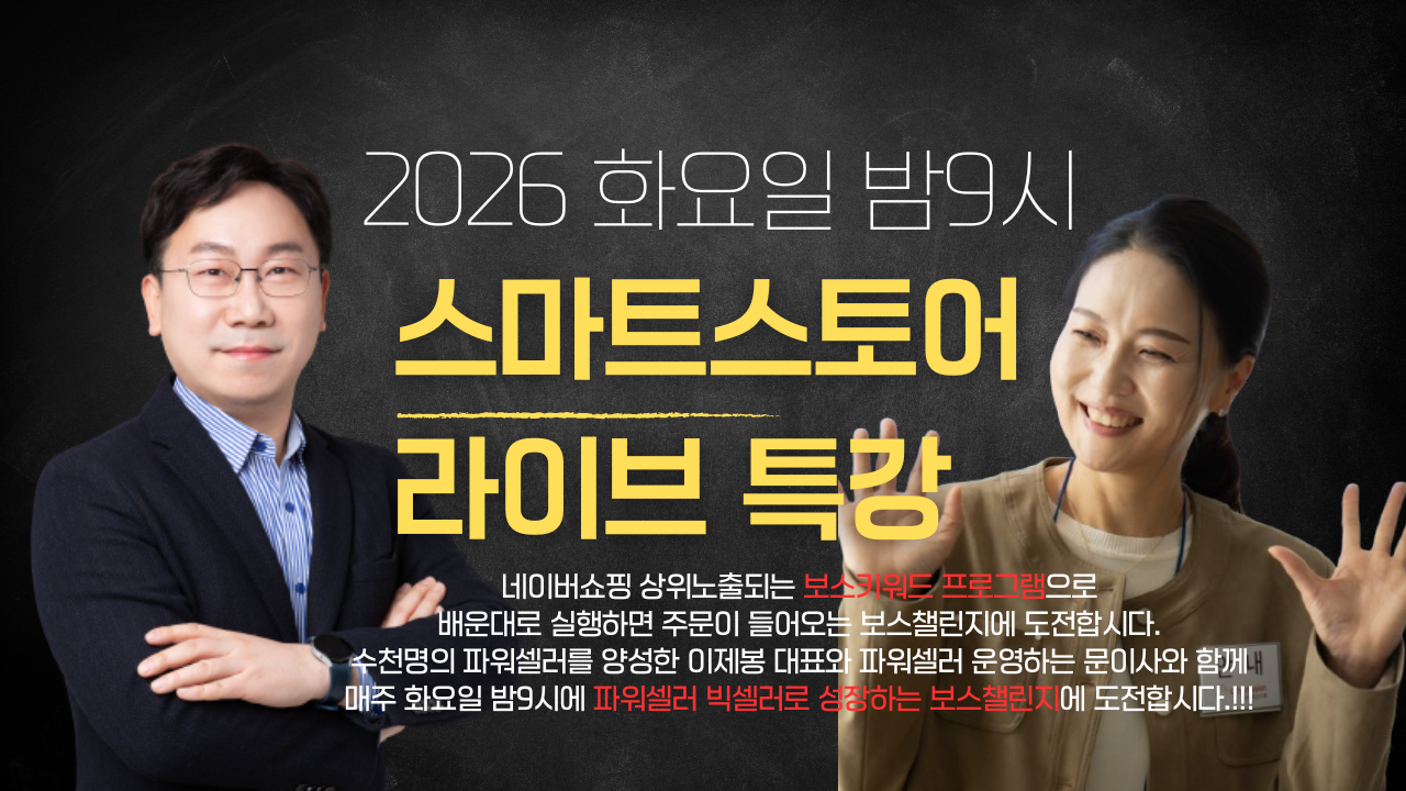 | 본문 | 매주 화요일 밤9시에 한시간동안 보스키워드 라이브특강을 줌온라인과 유튜브 방송을 진행합니다. 2026년 3월 3일 화요일 밤9시에는 더 특별한 시간으로 진행하였습니다. 보스키워드 개발하고 키워드 마케팅을 코칭하는 보스키워드 보스메이커 이제봉 대표와 여러개의 파워샵을 운영하는 문이사와 함께 가장 현실적인 성장 비결을 알려드렸어요. 매주 화요일 밤9시 보스키워드 미션챌린지 빅셀러 라이브특강을 진행하였습니다. 네이버쇼핑 상위노출 키워드 내상품 만들기를 정말 쉽고 빠르게 할 수 있는 보스키워드 ~~~ SEO 검색 엔진 최적화 알고리즘을 반영하여 네이버쇼핑에서 검색이 잘 되는 경쟁력있는 키워드를 빠르게 만들 수 있어요. 보스키워드 연간회원 국민사장님들과 함께 빅셀러로 성장합니다. 보스키워드 뉴버전출시 기념으로 더 특별한 혜택을 드립니다. 오늘은 온채널 도매몰에서 베스트 공급사를 구분하는 방법과 잘 판매가 되는 상품에 대한 문이사님의 비결도 나누는 시간과 보스키워드 프로그램으로 인기있는 상품 판매 요령도 알려드렸어요. 보스키워드 연간회원 국민사장님들은 온라인과 오프라인에서 보스스터디 특강과 소통방에서 함께 성장해요. GROWING TOGETHER BOSSPLUS !!!! #스마트스토어 #스마트스토어창업 #네이버쇼핑 #국민사장만들기 #보스키워드 #보스메이커 #보스플러스 #이제봉대표 #쇼핑몰창업 #키워드마케팅 #집에서창업 #온라인창업 #1인기업 #AI마케팅 #돈버는창업 #돈버는부업